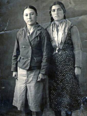 Аліме Ільясова (П) з подругою, ім'я якої невідоме. Початок 1940-х років