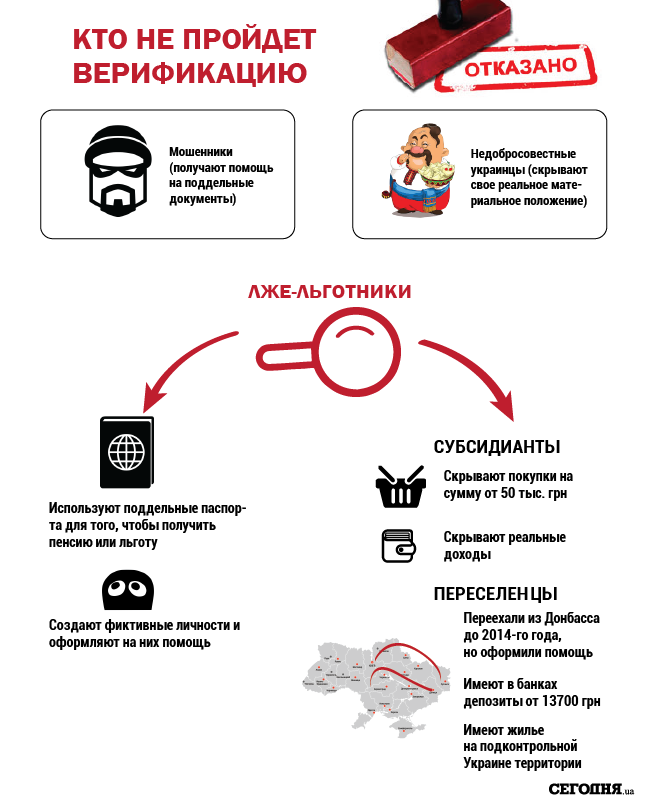 Верифікацію не пройшли близько 100 тисяч сімей переселенців. Кожна сім'я в середньомуотримувала 1314 гривень щомісяця. Для того, щоб залишити жителів окупованій території Донбасу без допомоги, необхідно, щоб переселенці відповідали хоча б одній з умов: