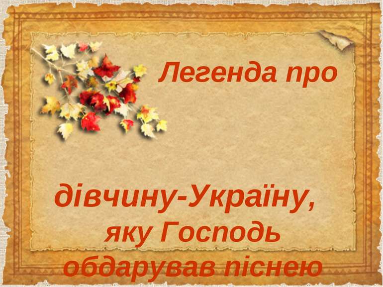 Коли це все було – ніхто не знає, Але легенда так розповідає: Надумав Бог про всіх подбати, Талантами людей обдарувати. Французам дав красу та елегантність, А німцям – дисципліну та педантність. Любов до моря дарував англійцям, Росії – владність, А голландцям – квіти. Ну, як таким дарункам не радіти! Підвівся Бог зі свого трону, Вдоволено поправив він корону. І тут побачив дівчину в куточку, Одягнену у вишиту сорочку. - Чом плачеш ти?Як звуть тебе, дитино? Вона відповіла: - Я – Україна. А плачу, Боже, бо не бачу меж Від пролитої крові і пожеж. Чому, скажи мені, така зла доля? В своїй землі немає правди й волі! - Так от яка історія твоя! Та тільки всі роздав таланти я – Скоріше треба було підійти… - І тут дівчина вже хотіла йти, Та Бог підняв правицю, зупинив. І з дівчиною знов заговорив: - Неоціненний скарб один я маю, Уславить він тебе у світі, знаю. Бери його та бережи. Це – пісня. – Взяла дарунок, до грудей притисла І понесла ту пісню по межі: «Нам, Боже, Україну, збережи!»