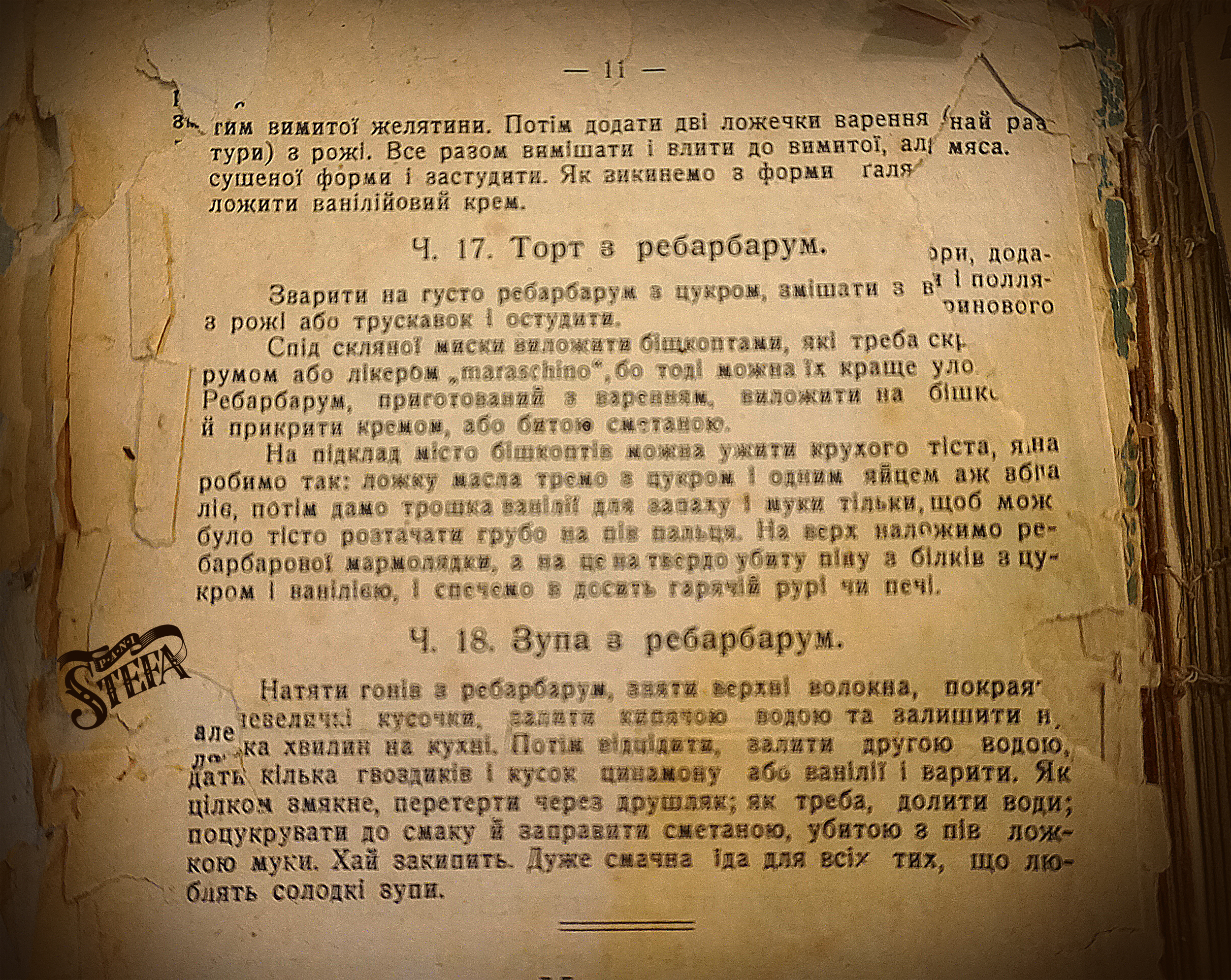 “Натяти гонів з ребарбарум, зняти верхні волокна, покраяти на невеличкі кусочки, залити кипячою водою та залишити на кілька хвилин на кухні. Потім відцідити, залити другою водою, дать кілька гвоздиків і кусок цинамону або ванілії і варити. Як цілком змякне, перетерти через друшляк; як треба, долити води; поцукрувати до смаку й заправити сметаною, убитою з пів ложкою муки. Хай закипить. Дуже смачна їда для всіх тих, що люблять солодкі зупи.”
