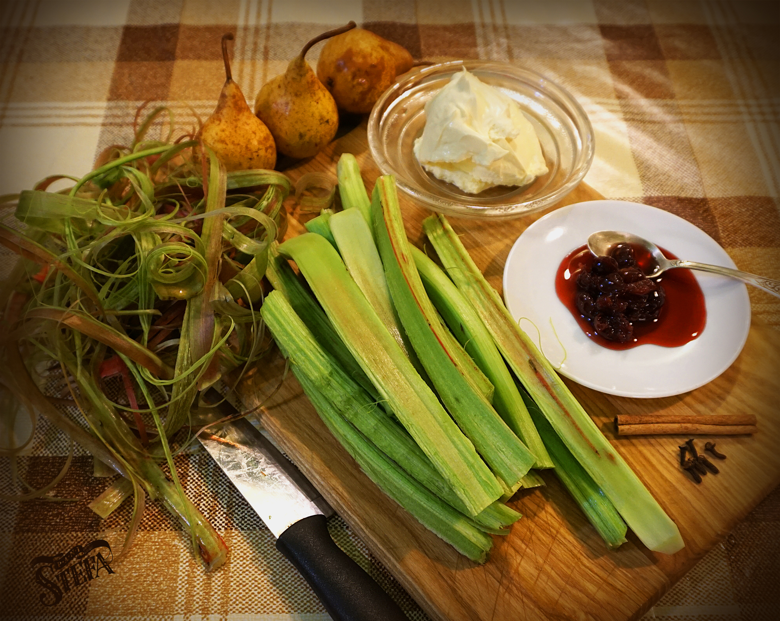 Тим часом помити, почистити і порізати рабарбар. Запарити родзинки. Мармоляду вимішати з потертими горішками.