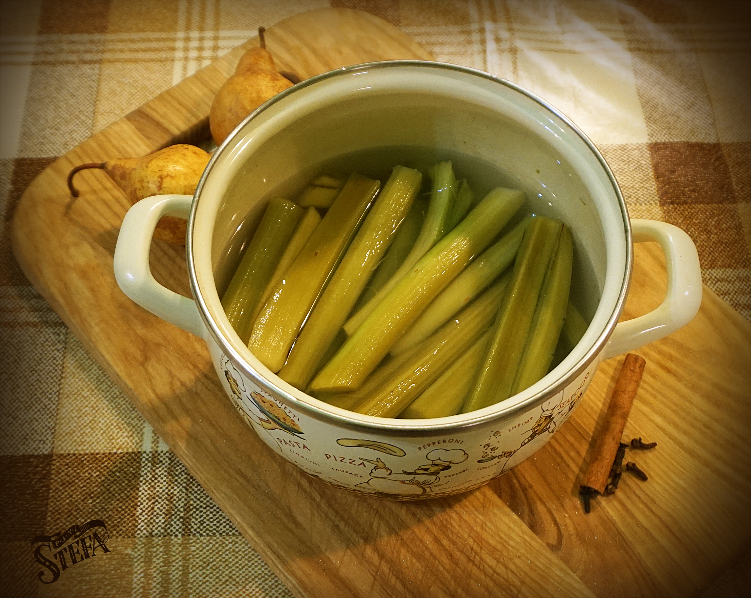 Для компоту я чищу тільки половину стебел, інші просто добре мию, обрізаю хвостики, але рожеву шкірочку не знімаю. Це дасть майбутньому компоту ніжно-рожевий, гарненький колір.