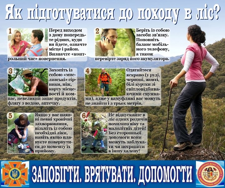 Насамперед повідомте близьких, куди ви вирушаєте на відпочинок. Якщо поблизу нікого немає – залиште записку з відповідним повідомленням, де будуть вказані дата, час виходу, кількість людей, які відправляються разом із вами, напрямок руху та орієнтовний час повернення. Обов’язково зарядіть удома мобільний телефон і заберіть його з собою на природу. Візьміть собі за правило перед мандрівкою до лісу подивитися карту або хоча б намальований від руки план місцевості та запам’ятати орієнтири.