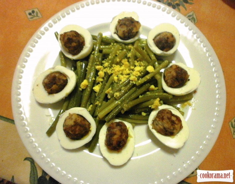 Зварити яйця. Розрізати на дві частини, видалити жовтки. В кожну половинку варених білків вкласти по котлетці, викласти на тарілку. В центр викласти пагони часнику, додати крихти розтертого жовтка.