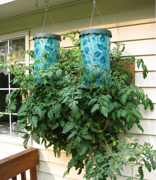"Як лише я не вирощував помідори, -- розповідаєгазеті Експрес господар. -- Однак тепер вирощую лише догори дригом. Цей спосіб вкрай простий. Знадобляться лише пластикові відра, або старі металеві без дна. В такому разі дно слід зробити із шматка пінопласту зробити посередині дна декілька малесеньких та один більший отвори. Наповнивши відра грунтом, висаджую розсаду томатів у великий отвір. Відра акуратно перевертаю в міцний пакет з отвором внизу, аби рослина була догори дригом, і зачіпаю пакет на спеціальних гаках".