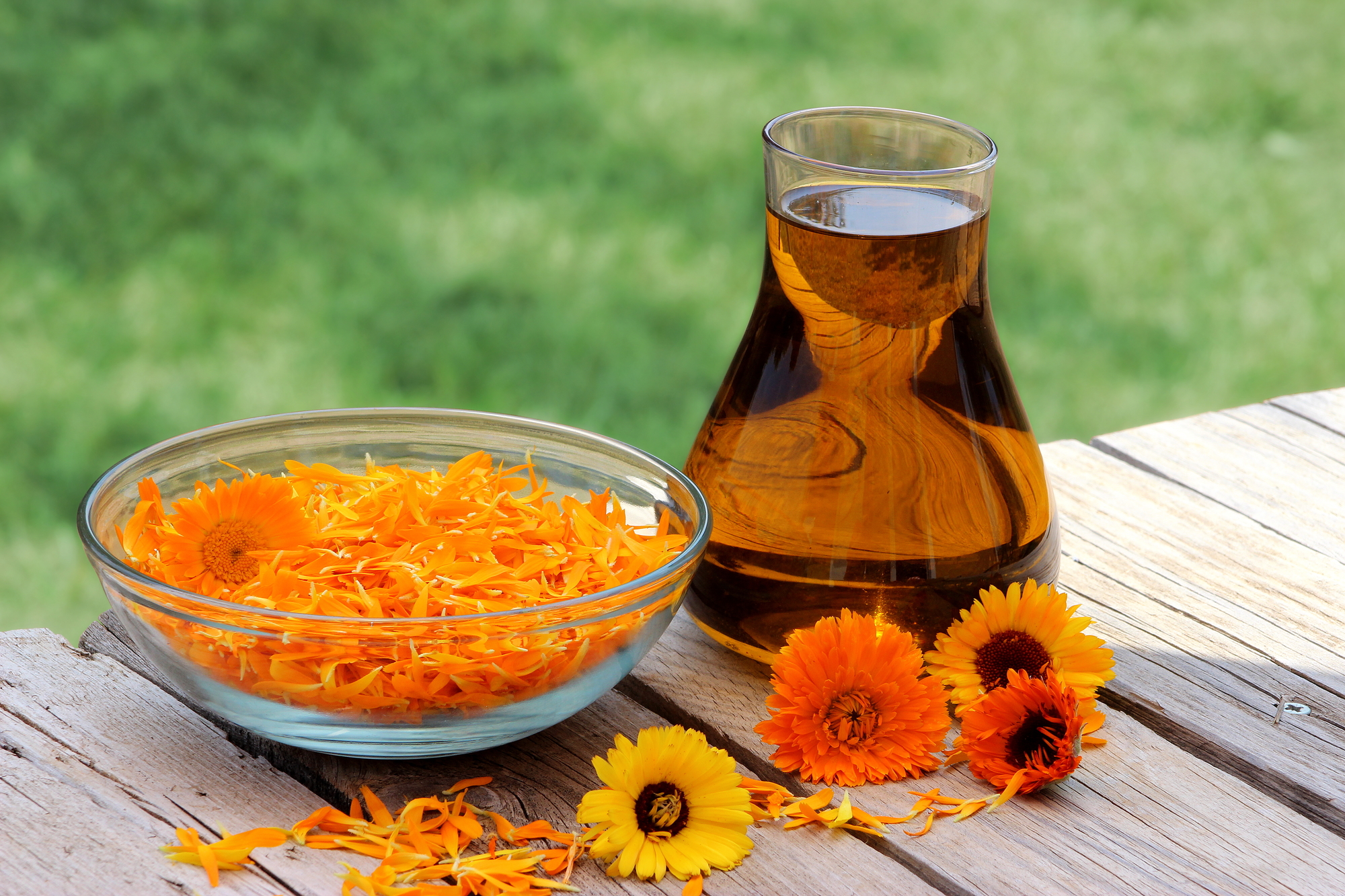 Спосіб приготування: 4-5 ст. л. свіжих квітів календули залити 0,5 л маслинової (соняшникової) олії, настояти на сонці 2 тижні, періодично струшуючи. Перецідити, зберігати в холодильнику.