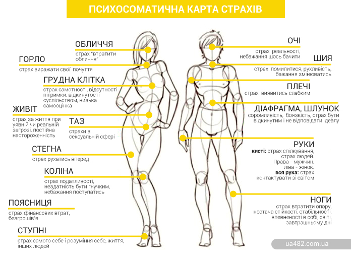 Почуття і страхи, які людина ігнорує, виливаються в проблеми зі здоров’ям і якщо продовжувати не звертати на них увагу – таких проблем буде додаватися все більше. Кожна частина тіла відповідає за певні страхи людини і залежно від того, в якому місці виникають неприємні відчуття, можна визначити, чого вона боїться.