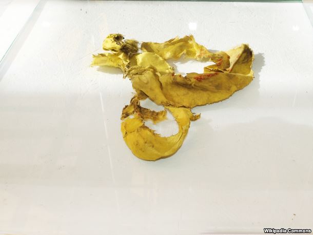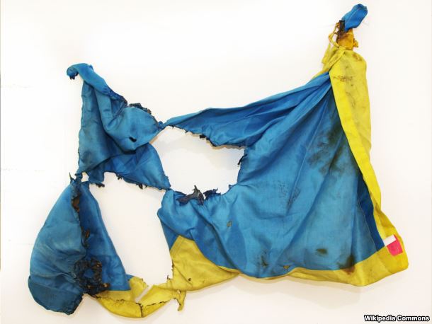 Фрагмент прапора з телевишки на горі Карачун (Виставка українських прапорів-реліквій на Софійській площі у Києві, 23-25 серпня 2015)