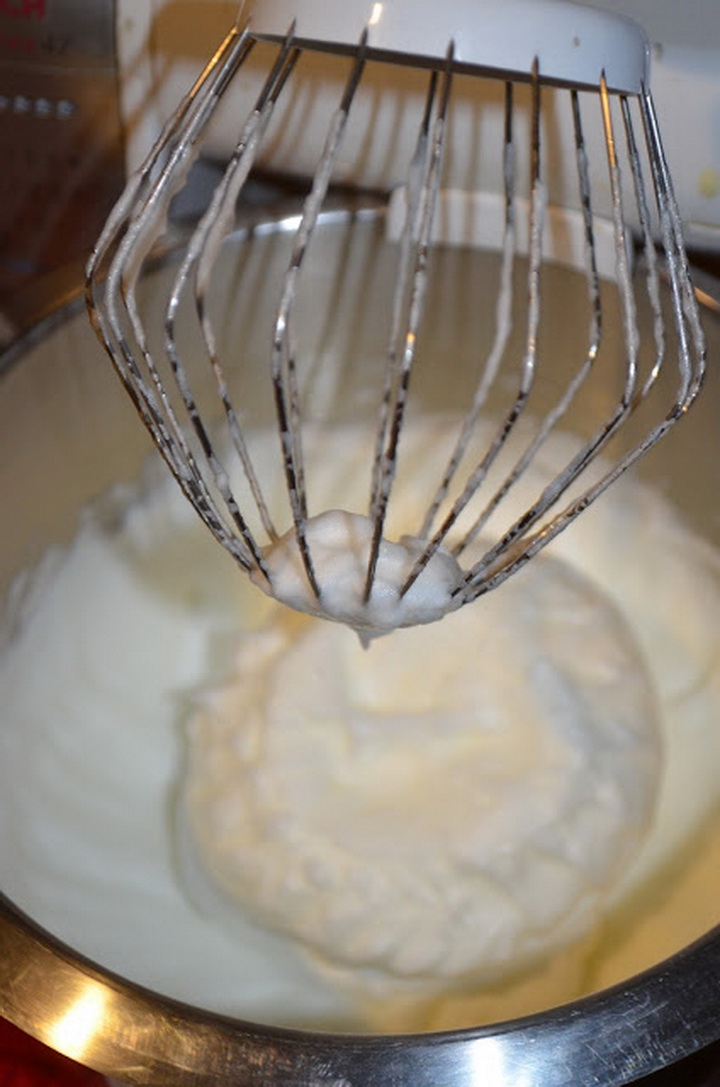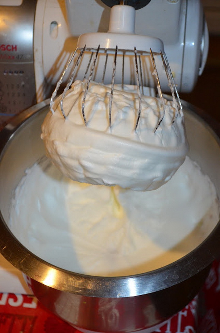 Додаємо 30 г цукру і продовжуємо збивати до стійких піків.