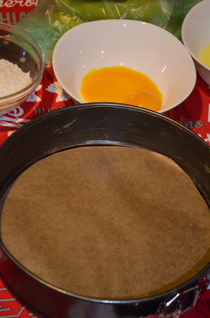 Для цього пирога ідеально підійде форма, розміром 20-22 см. Форму застеляємо пергаментом, змащуємо маслом і присипаємо борошном.