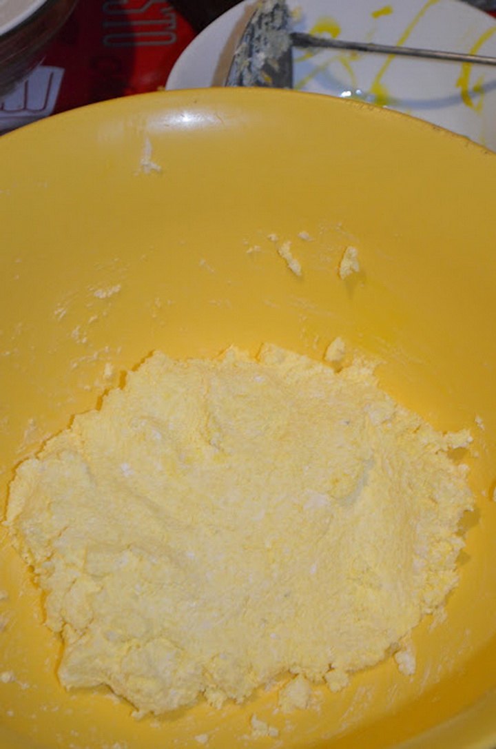 В миску викладаємо усі складники сирної маси: сир, жовтки, цукор, кокосову стружку та крохмаль. Розминаємо їх до однорідної маси з допомогою колотівки або ж руками. Тут вже кому як зручніше.