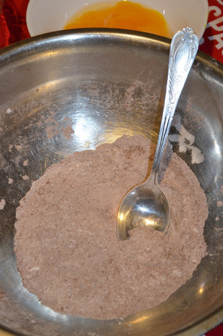А тепер приступаємо до бісквіту. Змішуємо усі сухі складники: борошно, крохмаль, какао, цукор, порошок до печива, ванільний цукор.