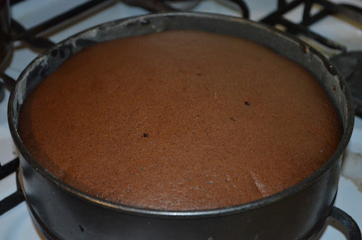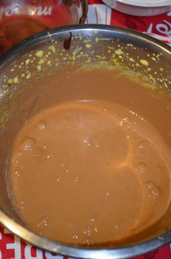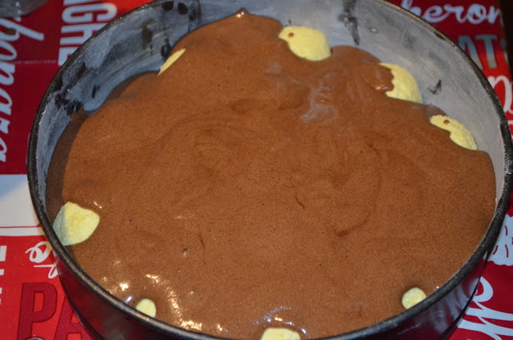 50 г шоколаду розтоплюємо на водяній бані чи у мікрохвильовці. Жовтки збиваємо з рештою цукру до пишної білої маси. Додаємо розтоплений шоколад і продовжуємо збивати.