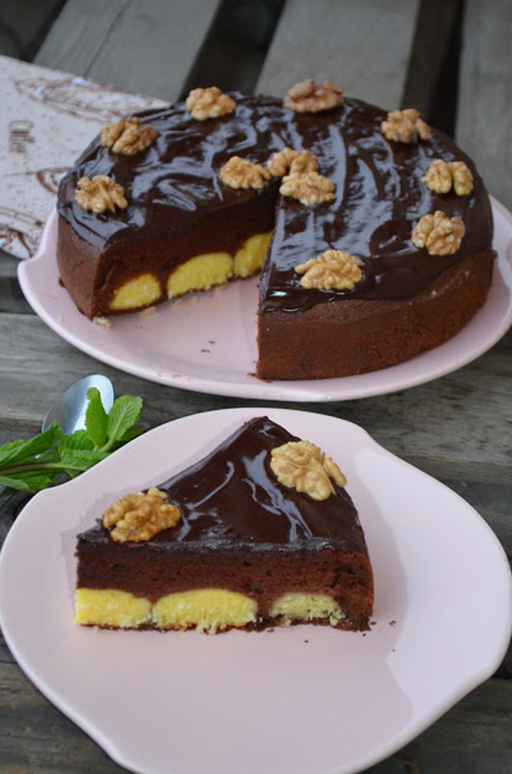 Приступаємо до приготування помадки. Змішуємо шоколад, масло та вершки, розтоплюємо на маленькому вогні чи у мікрохвильовці. Готовим люкером поливаємо пиріг. За бажанням можна прикрасити кокосовою стружкою чи іншими посипками. Я ж вирішила зробити це з допомогою грецьких горішків.