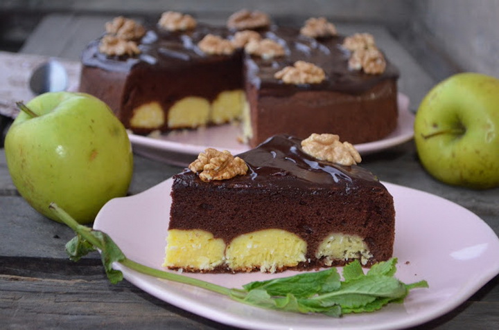 Пекти в розігрітій до 175 градусів духовці 45 хвилин. Готовність пирога перевіряємо сірником, якщо він сухий, можна витягати з духовки. Спеченому пирогу даємо десять хвилин на охолодження.