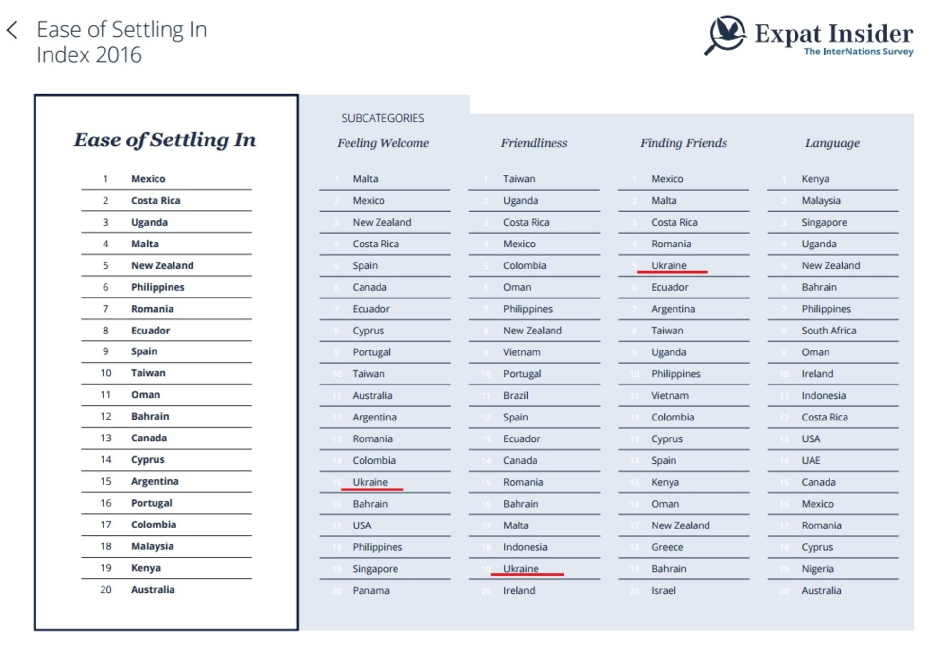 Україна посіла 15 місце за критерієм «гостинності», 19 місце за критерієм «доброзичливості» і 5 місце як країна для «пошуку друзів» за індексом «легкості облаштування» іноземців в країні hromadske.ua