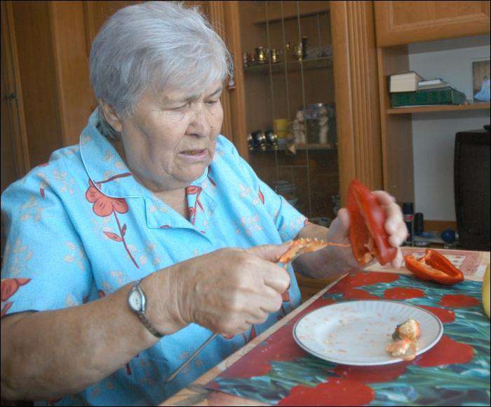 Зінаїда Миколаївна бере м"який помідор і розрізає його навпіл "по екватору". Обережно вигрібає насінини ножиком на тарілку.