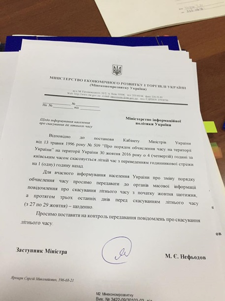 Крім того, в Мінекономрозвитку доручили Міністерству інформаційної політики України поінформувати населення про скасування літнього часу.