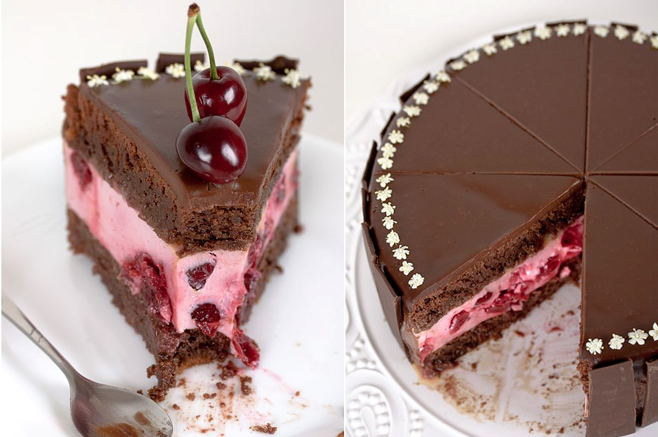 3. Злегка збийте вінчиком жовтки з 100 г цукру, Поставити на водяну баню на 7-8 хвилин, помішуючи, поки не загусне суміш. Відставити охолоджуватися. Желатин залити 4 ст.л. холодної води і дати набрякнути. Потім розтопити желатин, злегка підігрівши (не доводити до кипіння!), І влити в злегка ще теплу яєчну суміш. Розмішати, додати сметану (злегка збиту). Все перемішати, додати вишні з сиропом і збити. Крем буде злегка рідкуватий – це нормально, просто поставте його на кілька хвилин в холодильник.