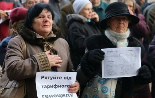 Близько сотні людей (більшість - похилого віку) намагаються пробратися в будівлю міськради. Учасники встановили намет і принесли плакати з гаслами "Вимагаємо мораторію на тарифи", "Подайте на ліки", "Стоп розкраданням комунального майна", "Нам не потрібна влада, яка є ворогом народу".
