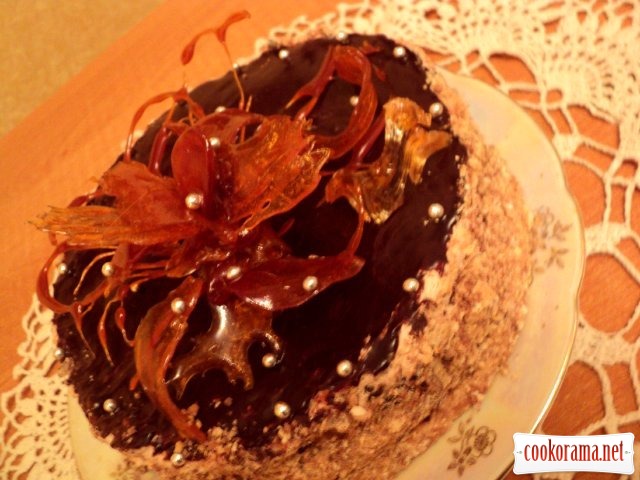 Дістаємо торт з холодильника, поливаємо глазур'ю, в центр викладаємо карамельну квіточку, а боки посипаємо подрібненими волоськими горіхами.