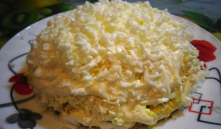Натирайте кожен шар над тарілкою, щоб салат вийшов дійсно повітряним і ніжним. Викладаємо салат шарами, роблячи між ними майонезну сітку.