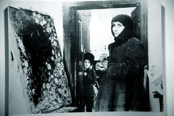 Катерина Білокур пише картину "Цар-Колос" у своїй хаті в Богданівці, 1950-ті роки