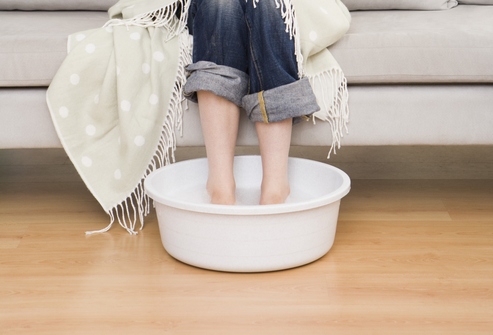 Опустіть Ваші нижні кінцівки в таз з гарячою водою (температура води приблизно 40 градусів), попередньо додавши туди і розчинивши 3 столові ложки гірчиці у вигляді порошку. Потримайте ступні в тазу близько півгодини, після чого насухо витріть і надіньте теплі шкарпетки.