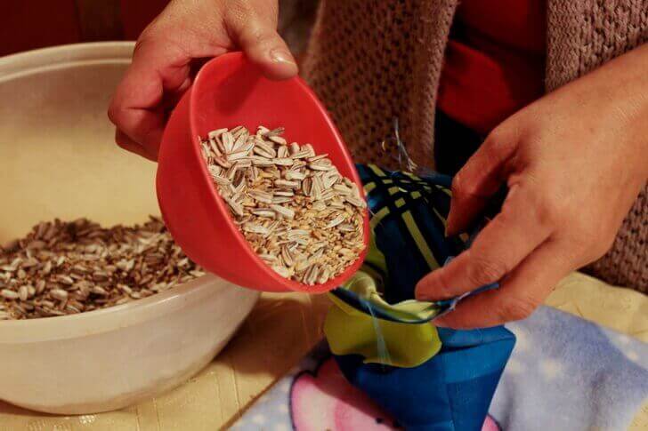 • Додайте потрібну кількість насіння в мішечок, але не заповнюйте його повністю. Він не повинен бути твердим на дотик.
