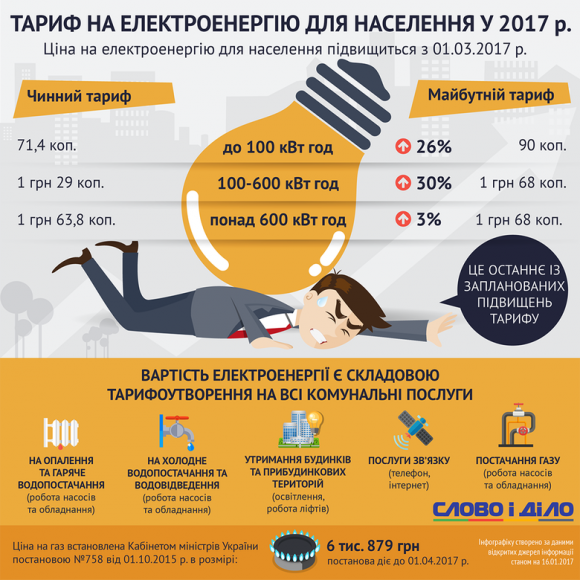 З 1 березня в Україні підвищать тариф на електроенергію для населення. Ціна за кіловат (від 100 до 600 кВт — авт.) підніметься з 1,29 до 1,68 гривні. Це є останнім підвищенням згідно з меморандумом із МВФ від лютого 2015 року. vn.20minut.ua