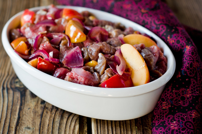- Виклади печінку в сотейник поверх яблук, а зверху помісти обсмажену цибулю. Відправляй печінку в розігріту до 200°С духовку і запікай без кришки приблизно 15-20 хвилин.