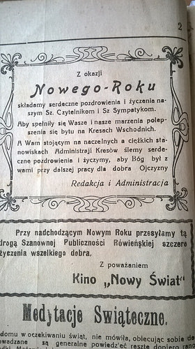 Рівненські газети «Еcho Rowenskie», «Дзвін», «Волинське слово» друкували різдвяні та передноворічні вітання від урядових установ, організацій, великих та малих магазинів, ресторанів, цукерень і кав'ярень.