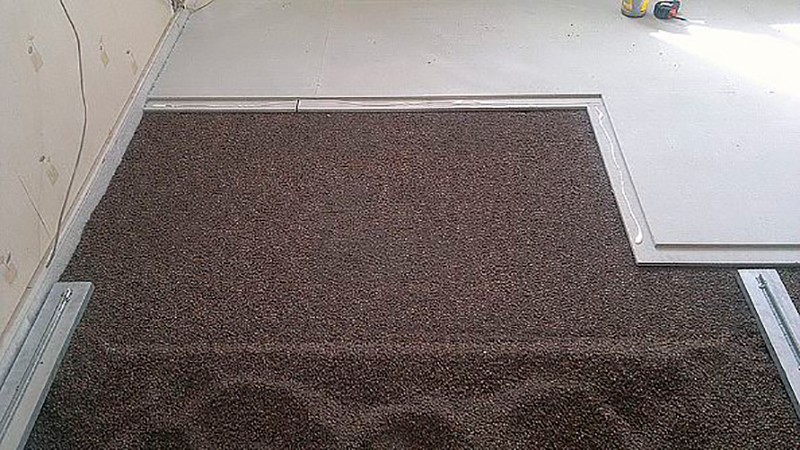 - Тепла суха стяжка. Це деяка подоба керамзиту – відрізняє їх ретельно підібрані гранули, за рахунок чого ефективність утеплення декілька вище. Крім того, це дуже вдала спроба поєднати стяжку з дерев’яною підлогою. По суті, це підсипка гранульованого матеріалу, зверху якої (прямо на неї) укладається листовий матеріал – гіпсоволокнисті плити. По своїм прочностним характеристикам таку підлогу мало чим поступається стандартної цементно-піщаній стяжці або дерев’яному настилу – натомість ви отримуєте просту технологію монтажу і відсутність мокрих процесів. Облицювати таку підлогу можна будь-яким оздоблювальним матеріалом.