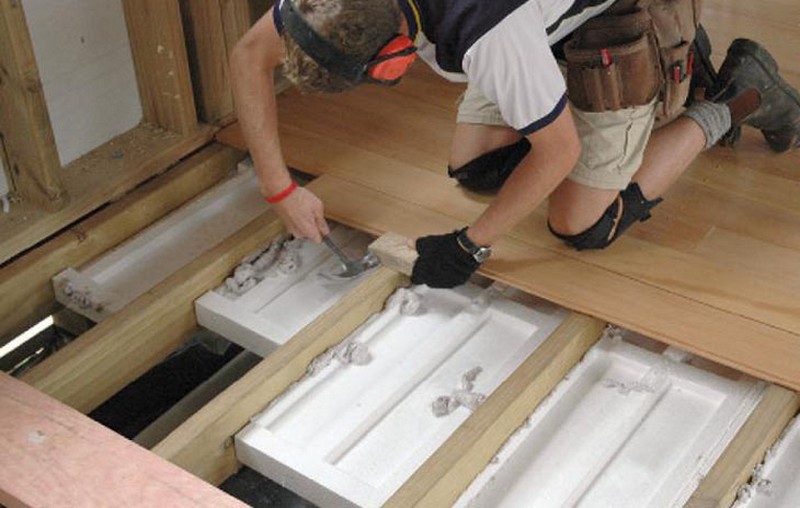 - Пінопласт – набивати його щільно в підпіллі (так, щоб настил стикався з ним) буде неправильно. Таким способом ви воспрепятствуете вентиляції підпілля, від чого постраждає дошка – просто кажучи, без належного провітрювання вона буде гнити прискореними темпами. Між настилом і пінопластом потрібен зазор як мінімум пару сантиметрів – так, він дещо знижує ефективність утеплення, але зате зберігає підлогу протягом тривалого часу. В принципі, якщо в підпілля не буде припливу повітря з вулиці, то й утеплення виявиться ефективним – доведеться приділити особливу увагу закладенні щілин.