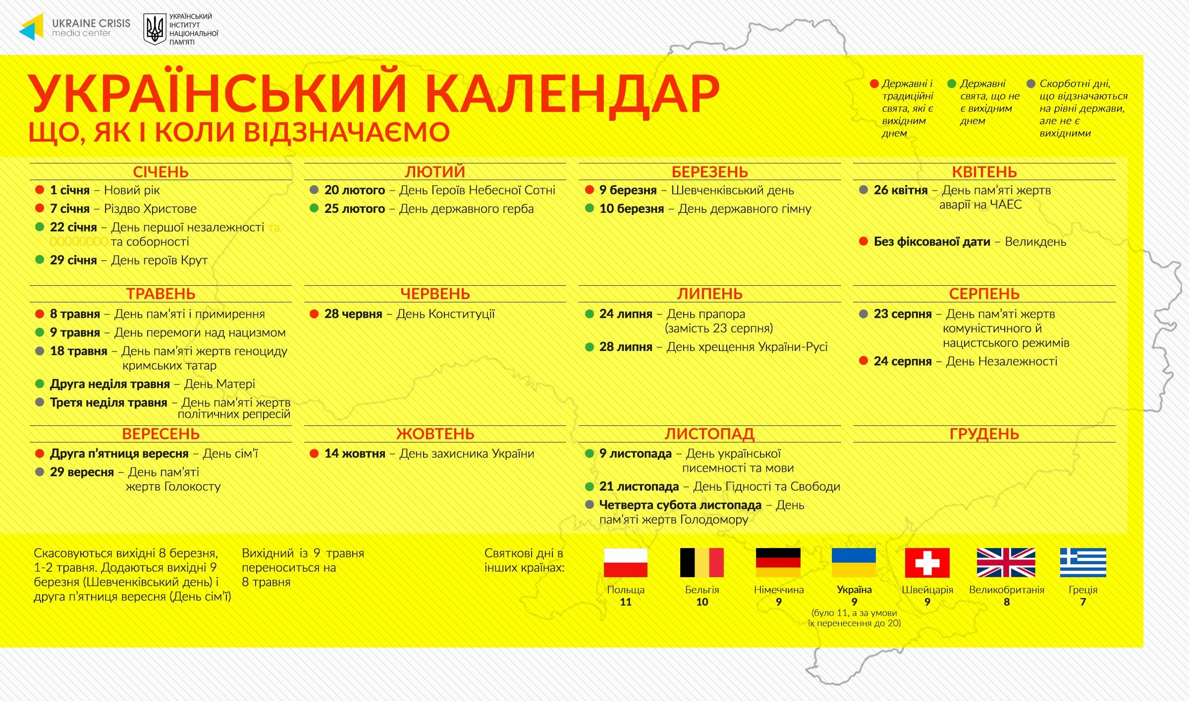Так, Інститут національної пам'яті пропонує відзначати такі державні свята, які є неробочими днями: Шевченківський день – 9 березня; День пам'яті та примирення – 8 травня; День Конституції України – 28 червня, День Незалежності України – 24 серпня; День родини – друга п'ятниця вересня; День захисника України – 14 жовтня.