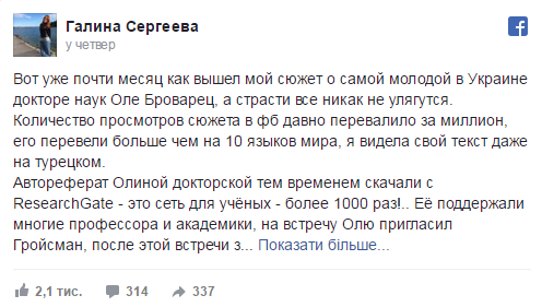 «Люди, чий індекс Хірша (рівень цитованості) приблизно 2, стверджували, що Оля з її рівнем 21 – це не так вже й круто, подумаєш. І відкриття не таке вже й світового масштабу, і навіщо було й зовсім зустрічатися з журналістами, попіаритися захотіла, дівчинко?.. А до Гройсмана навіщо ходила? Покликали? Треба не погоджуватися!.. Скромнішою треба бути! І до чого ти, фізик, взагалі полізла в сферу хімії, а?» – розповіла Галина Сергєєва.