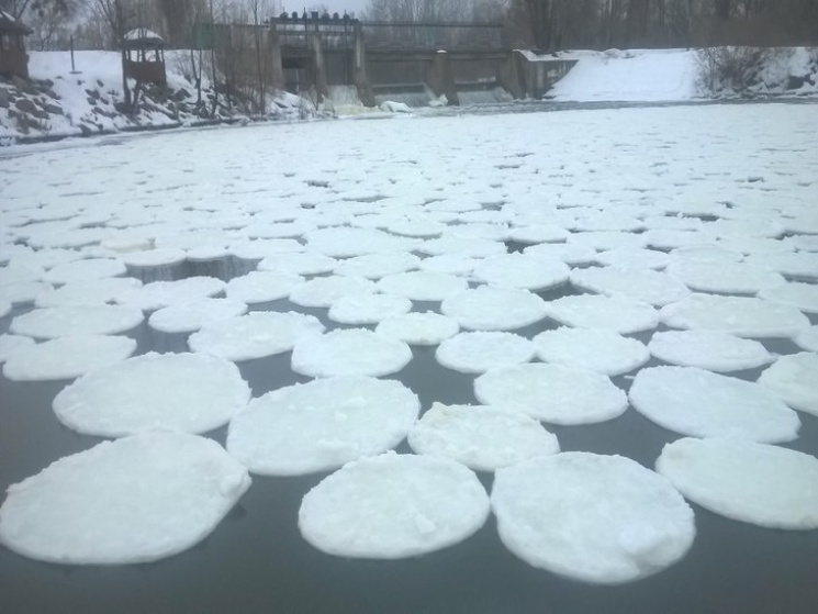Незвичне явище, що утворилося біля дамби на полтавській річці Ворскла, цьогоріч активно обговорюють в інтернет-мережі жителі різних міст України. Фото, на яких приблизно однакові за розміром (діаметром 30-40 см) круги з льоду рясно услали водне полотно та нагадують білі тарілки, які близько одна до одної масово рухаються річкою за течією, бурхливо обговорюють та перепощують в соцмережах користувачі. vpoltave.info
