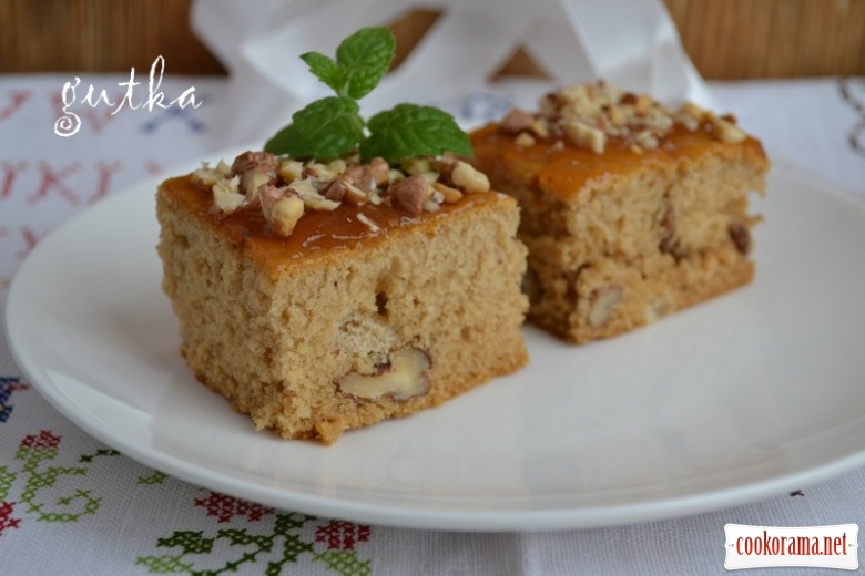 Готовий пиріг можна зверху змастити абрикосовим джемом та густо посипати подрібненими підсмажненими грецькими горіхами.