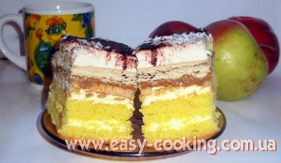 Складаємо пляцок таким чином: нижня частина бісквіта, потім половина крему, верхня частина бісквіта, друга половина крему. Зверху викладаємо шар печива, потім шар вареного згущеного молока, знову печиво. На печиво викладаємо кавове суфле.