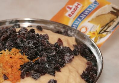 Через годину додаємо в тісто всю цедру, ванілін і родзинки.