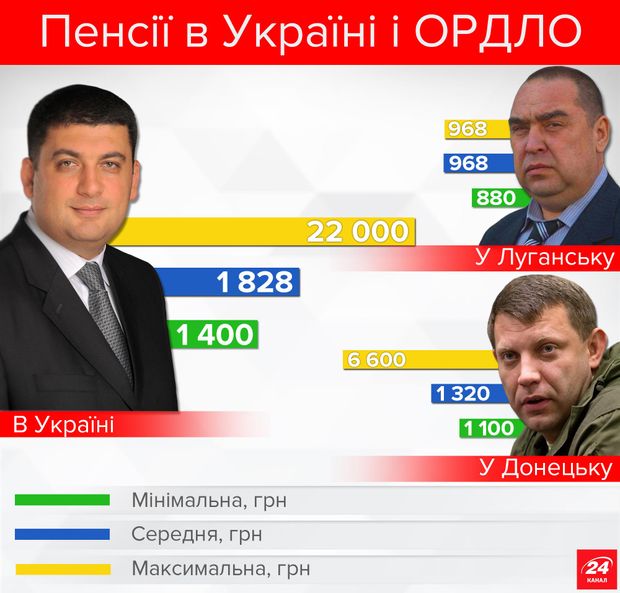 У "ДНР" тим часом збільшували пенсії влітку 2016-го на 10% — 400 рублів (176 грн.) За даними "РИА Новости Украина" розмір середньої пенсії в Донецьку становить трохи більше 3 тисяч рублів, мінімальна — близько 2,5 тисячі рублів, а максимальна — в межах 10-15 тисяч рублів, що дорівнює, відповідно, 1100, 1320 та 6600 гривень (за курсом 44 копійки за рубль).