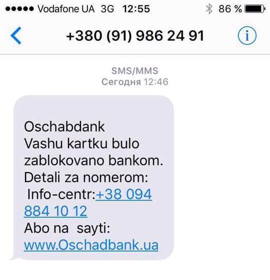 Будьте пильні. Тільки що мені прийшло повідомлення з Ощадбанку про те, що моя картка заблокована. "Жах! Знову витратив усі гроші і заліз в мінус!", - подумав я і тут згадав, що у мене немає ніякої карти Ощадбанку. Так пише на своїй сторінці в Фейсбуці Алексей Давиденко, передають Патріоти України і цитують далі: