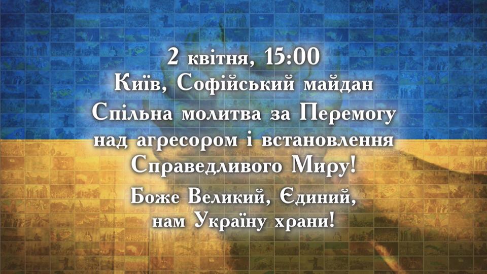 У неділю, 2 квітня, у Києві на Софійському майдані, а також по всій Україні (в обласних центрах) та діаспорі, за ініціативою членів Всеукраїнської Рада Церков і релігійних організацій, відбудуться молитовні заходи за мир в Україні та звільнення її від окупантів.