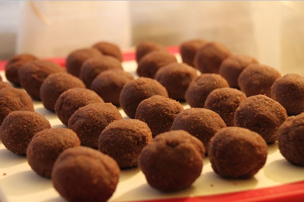 5. Сформуйте з суміші кульки. Частину кульок обваляйте в кокосовій стружці, частину – в цукровій пудрі і частину – в суміші 1 ст. ложці какао і 1 ст. ложці мелених крекерів.