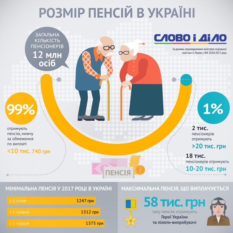 Планується, що до кінця поточного року рівень мінімальної пенсії в Україні наблизиться до 1373 гривень замість 1247 гривень. Всього 1% громадян на даний час отримує 10 740 гривень, а найвищий показник складає 58 тисяч гривень (для колишніх льотчиків та Героїв України). При цьому близько 2 тисячам осіб щомісяця нараховують 20 тисяч гривень.