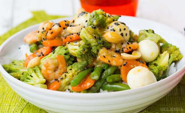 4. Змастіть маслом форму, викладіть на неї овочі, зверху додайте креветки.