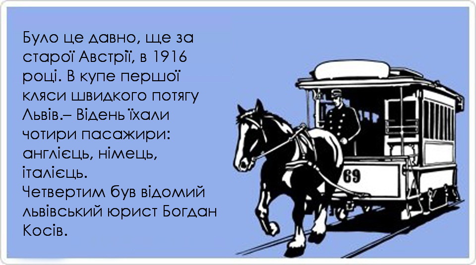 Було це давно, ще за старої Австрії, в 1916 році. В купе першої кляси швидкого потягу Львів – Відень їхали чотири пасажири: англієць, німець, італієць.