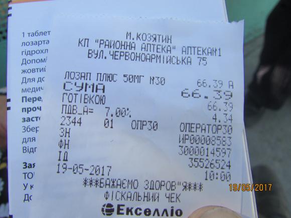 Але на чеку з аптеці при лікарні вказаний “Лозап +”, в якому 50 мг діючої речовини й ціною зі скидкою 22 гривні за пластинку