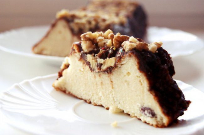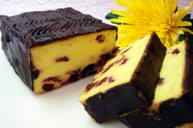 Рецепт. Сир, ванільний цукор і картоплю подрібнити у блендері до однорідності або пропустити через м’ясорубку. Додати масло, цукор і жовтки яєць, усе добре збити і наприкінці додати родзинки з тертою цедрою апельсина. Окремо збити білки до густої білосніжної консистенції і акуратно вмішати їх у сирну масу, викласти сирне тісто у форму для випікання. Запікати при температурі 180º протягом 40 хвилин. Полити шоколадною глазур’ю. Бажано, щоб перед подачею на стіл сирник постояв 5-6 годин у холоді.