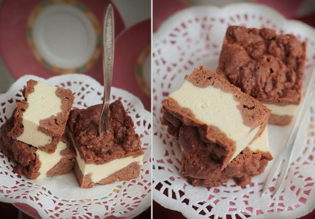 Рецепт. Щоб приготувати сирну масу, потрібно сир (пропущений через м’ясорубку або збитий у блендері), 4 жовтки, цукрову пудру, столову ложку борошна, ванільний цукор, 50 грамів масла і крохмаль вимішати до однорідності. Білки збити до консистенції крутої стійкої. Частину з’єднати із сирною масою. Для приготування шоколадної маси необхідно в каструлю вилити молоко, додати цукор, какао, 125 грамів масла і шоколад. Варити на маленькому вогні до утворення однорідної маси, постійно помішуючи. Просіяне борошно, розпушувач і жовтки додати до охолодженої шоколадної маси, все вимішати і наприкінці додати частину збитих білків, акуратно перемішати. У форму для запікання спершу викласти половину шоколадної маси, на неї ложкою рівномірно викласти сирну масу і залити все шоколадною сумішшю, що залишилась. Випікати близько години при температурі 180º. Охолоджувати у напіввідчиненій духовці, щоб сирник відразу не осів.